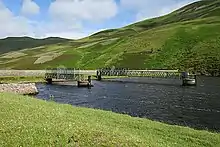 Near to Talla Reservoir is the Fruid Reservoir, built to impound the waters of the next upstream tributary of the Tweed, the Fruid Water. The top water level is 1,024 feet (312 m) above sea level,[26] and it covers an area of 344 acres (139 ha).[27] Construction started in 1967, and surplus water is used to top up Talla Reservoir.[28] In 2014, a survey of the Talla aqueduct, which now carries water from Fruid and Talla to a new water treatments works at Glencorse, was undertaken, after which 1,150 feet (350 m) of the tunnels were refurbished. In addition, new valves were fitted to the valve chambers. Jacobs were the consulting engineers for the £2.6 million project, and the contractor was George Leslie.[29]
