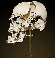Edmé François Chauvot de Beauchêne was the inventor of the disarticulated or exploded human skull used for medical teaching, known as the Beauchêne skull.[2] The skull bones are disarticulated along the sutures and mounted at a distance on brass supports. The bones are attached to the brass rods by rivets and the assembly is mounted on independent adjustable and modular brass rods which allow the jaw to advance and the top of the skull to be tilted back. Dentition is revealed with dissection of the left cortical bone showing the dental roots and with the nerve branches pigmented in red. One fabricator was Maison Tramond, 9, rue de l'ecole de Medicine, Paris. The skulls were supplied by the medical school.