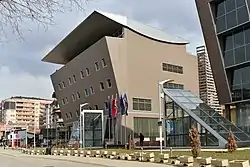 The National Library of Kosovo, which has been known with different names throughout the history of Kosovo, is an important educational institution for the city of Pristina.[44] The current building was inaugurated on November 25, 1982. It has a space of 16,500 square meters and it consists of 99 domes.[44] This Library serves as the central librarian institution of Kosovo and as center of librarian information in national level.[44]