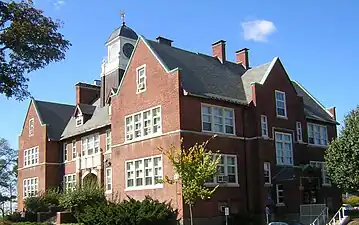 The Edward B. Newton School is a historic school building at 131 Pauline Street in Winthrop, Massachusetts. It is a large H-shaped 2+1⁄2-story brick Tudor Revival building, set on the north side of Pauline Street in central Winthrop. It was designed by William M. Bacon and built in 1908.[2] It was named after Edward B. Newton, a longtime Winthrop resident who was a member of the school committee for 17 years, who donated funds for the clock.
