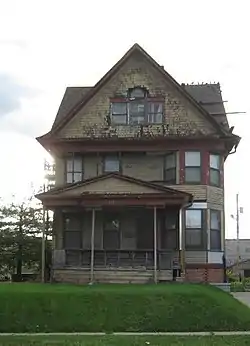 The Edward B. and Nettie E. Evans House is a historic building located in Des Moines, Iowa, United States. It is significant as the best Free Classic Queen Anne style dwelling in the city.[2] It is a transitional architectural style. The 2½-story structure shows elements of both the Queen Anne and the Neoclassical styles. The Queen Anne is found in the asymmetrical plan, the complex roof treatment, the full width and recessed porches, and contrasting shingle patterns. The Neoclassical is found in the window and door trim, the grouped classical porch columns, and the Palladian window in the attic level.
