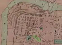 An 1870 map of Chicopee Falls; Bellamy's property is outlined in green