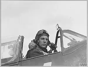 ![]() Charles seated in the cockpit of his Spitfire fighter, 1943 | |