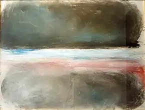 Clark hit upon his signature technique in the mid-1950s in Paris, when striving to cover a larger area of canvas with broader, straighter strokes than possible with his wrist and conventional paintbrushes. He picked up a janitor’s push broom. Especially later when he placed the canvas on the floor, the broom in Clark’s hands spread color in wide, often horizontal swaths that spoke of energy and speed.[1][3] He called it his “big sweep.”[6] From oils in his early years, he moved on to brilliant acrylics on large canvases, and softer, quieter dry pigments on paper.[7] Though abstract, the compositions could sometimes suggest ethereal landscapes, even human forms.[3] He had his signature colors as well. Pink “is to him what orange was to Cezanne and yellow to Van Gogh,” wrote art critic April Kingsley.[8]