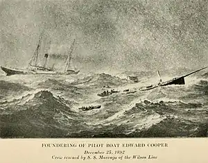 On Christmas Day, December 25, 1892, the Cooper fell victim of a snowstorm when waves crashed into the boat causing her to sink. The crew were rescued by the Wilson Line S. S. Marengo. Thomas Marks and John Hammer were pilots on the Cooper.[9][10] The Edward Cooper was replaced by the Joseph Pulitzer, No. 20, on February 21, 1894, at Essex, Massachusetts for the New York Captain Jacob M. Heath.[11]