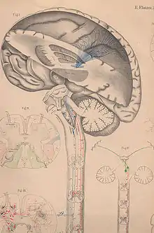 His law played an important role in the initial studies of the spinal cord. With the Berlin neurobiologist Johannes Gad, Flatau performed experiments on dogs and criticized the Bastian-Bruns law concerning the loss of function following spinal cord injury (1893). On the basis of numerous clinical spinal cord surgeries, experiments, and subsequent observations, he discovered that the "greater the length of the fibres in the spinal cord the closer they are situated to the periphery" (Flatau's law). He provided evidence for the laminar arrangement of spinal pathways. [27] He also described the fifth, seventh, and eighth cranial nerves, and carefully outlined their nuclei. The paper on this topic, Das Gesetz der excentrischen Lagerung der langen Bahnen im Rückenmark, was published in 1897. For this work he received a PhD in medical sciences in Moscow in 1899 (dissertation Zakon ekstsentricheskago raspolozheniia dlinnykh putei v spinnom mozgu) [28] This work was presented in 1949, next to a portrait of the author, on display at the IV International Congress of Neurologists in Paris.[14]