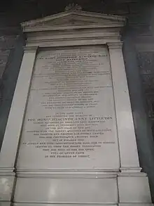 Memorial to Sir Edward Littleton, the 4th and last baronet, who died without issue in 1812, leaving the estates to his great-nephew. St. Michael and All Angels, Penkridge.