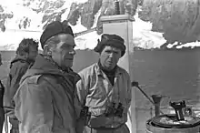 ![]() Edward Bingham (on the right), FIDS commander, in the Antarctic Dec 1945 | |