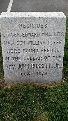 Memorial stone commemorating the location in Hadley, at 102 Russell Street, near Whalley St., where Whalley & Goffe stayed in hiding. The stone reads: REGICIDES LT. GEN. EDWARD WHALLEY, MAJ. GEN. WILLIAM GOFFE, HERE FOUND REFUGE IN THE CELLAR OF THE REV. JOHN RUSSELL, JR., 1664–1676.