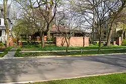 Edwin H. Cheney House (1903) located in Oak Park, Illinois, United States, was Frank Lloyd Wright's design of this residence for electrical engineer Edwin Cheney.[2] The house is part of the Frank Lloyd Wright–Prairie School of Architecture Historic District.[3] A brick house with the living and sleeping rooms all on one floor under a single hipped roof, the Cheney House has a less monumental and more intimate quality than the design for the Arthur Heurtley House. The intimacy of the Cheney house is due to the building not being a full story off the ground and being sequestered from the main street by a walled terrace. In addition, its windows are nestled between the wide eaves of the roof and the substantial stone sill that girdles the house.[4][5]