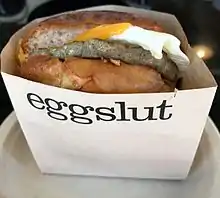 Eggslut (stylized as eggslut) is a sandwich restaurant chain with locations in Los Angeles, Las Vegas, Tokyo, Seoul, Kuwait, London, Singapore and Hong Kong, known for its signature dish "The Slut", a coddled egg on pureed potatoes, as well as their egg sandwiches.[1] It was founded by Alvin Cailan.[2]