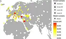 A 2017 study of the mitochondrial DNA and Genome wide DNA composition of Egyptian mummies has shown a high level of affinity with the DNA of the populations of Western Asia and Anatolia.[69][70] The study was made on mummies of Abusir el-Meleq, near El Fayum, which was inhabited from at least 3250 BCE until about 700 CE.[71] A shared drift analysis of the ancient Egyptian mummies is highest with ancient populations from the Levant and Anatolia, and to a lesser extent modern populations from the Near East and the Levant.[70] the Admixture analysis and PCA show the most affinity to ancient and modern middle eastern populations.[71]