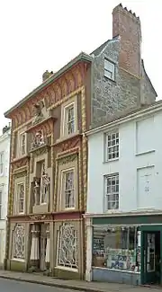The building was later neglected and was repainted "brightly but inexpertly" by Norman Shipton in 1960.[3][10] In 1973, it was acquired by the Landmark Trust and scaffolding, which had been erected for several years, was removed to reveal a refurbished building and a new exterior colour scheme of brown and creams.[2][3] The architect Paul Pearn of Plymouth concluded that these were the original colours after stripping layers of paint from the elaborate mouldings which were mainly of coade stone.[10] The building continues to be managed by the Landmark Trust, with two shops on the ground floor and holiday accommodation on the upper floors.[3][10]