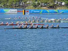 The eight is a rowing event held at the Summer Olympics. The event was first held for men at the second modern Olympics in 1900, and has been held at every Games since. The women's event was added when women's rowing was added to the Olympic programme in 1976, and has been held at every Games since 1996, it is the only Olympic rowing event that uses a coxswain.