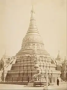 Eindawya Pagoda (Burmese: အိမ်တော်ရာဘုရား; lit. 'royal house pagoda') is a Buddhist stupa located in Mandalay, Myanmar.[1] It was built by King Pagan Min in 1847,[1] on the site of his residence before he ascended the throne; gilt from top to bottom; a shrine of fine proportions.[1] The pagoda was built on the site of Pagan Min's summer house, when he was a prince.[2] The pagoda stands at a height of 114 feet (35 m).[2]