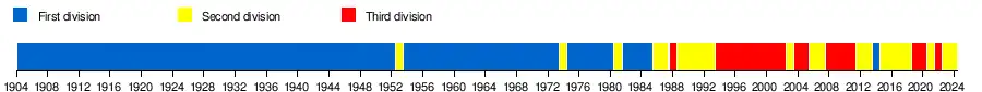 The club played in the Bundesliga through to the mid-1980s having been relegated just twice, playing in the second division in 1973–74 and again in 1980–81. During the club's run of 322 games in the Bundesliga from 1963 to 1973, it set a record that still stands by not seeing a single player red-carded.[13] In 1984–85, Eintracht Braunschweig was relegated from the Bundesliga for the third time.