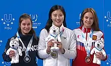 Aurélie Monvoisin (left), Kim A-lang (centre) and Ekaterina Efremenkova (right), in speed skating short track 1500m, 29th Winter Universiade (2019), Krasnoyarsk, Russia