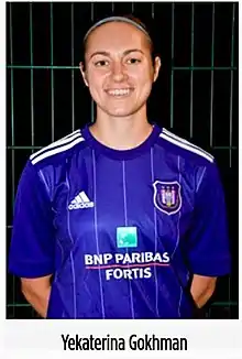 Yekaterina (Katya) Lazareva Gokhman (also translated as Ekaterina, born 25 March 1990) is a former Russian professional football defender who played for RSC Anderlecht in Belgium.[1] She previously played in many different countries, for Ryazan VDV in the Russian Women's Football Championship league, Kokkola F10, Víkingur Ólafsvík, Apollon Limassol and Spartak Subotica, Serbia. She also played for the Russia women's national football team and the under 19 team.[2]