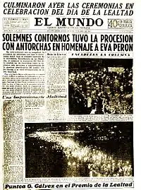 When General Juan Perón was elected president in 1946, he was eager to control the press, hoping to avoid the coups which had been supported by Argentine journalism; these had occurred frequently since 1930. Editorial Haynes was then owned by the Haynes family member Henry Wesley Smith.[1] Early in 1949, the Peronists acquired a majority stake in Editorial Haynes, which at that time published ten periodicals. They forced El Mundo and the other Haynes publications, to become Peronist. Major Carlos Aloe, a friend of Eva Perón, was made head of the enterprise at Eva's personal request, despite his protests that he knew nothing about the business.[4] The paper became an organ of Peronist propaganda. Editorial staff were required to hold a Partido Justicialista membership card or were summarily dismissed.[1]