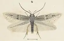 The wingspan is 6–8 mm. The forewings are dark grey, irrorated with whitish. The basal area in females is distinctly paler. There is an oblique pale fascia before the middle, which is very obscure and indistinct in males, while it is white and conspicuous in females. Beyond this is a more or less defined blackish suffusion, tending to form two separate spots, the lower more marked. There are indications of a short longitudinal dark fuscous streak in disc at about two-thirds. In females, there are two conspicuous white opposite almost connected spots beyond two-thirds, while they are not traceable in males. The hindwings are grey.[3]