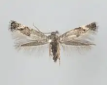 The wingspan is 7–8 millimetres (0.28–0.31 in).[1] The head is grey, face whitish. Forewings in male grey, in female blackish-grey ; plical stigma black, elongate, followed by a white dot ; an oblique white triangular costal spot at 2/3 ; a small indistinct whitish tornal spot somewhat beyond it. Hindwings grey.grey.[2]