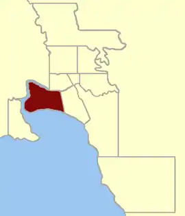 Commencing at the junction of the River Yarra and the Saltwater River; thence by the River Yarra to a point due south of the Gas Works; thence by a line south-easterly to a point on the shores of Hobson's Bay, twenty chains more or less westward of the Battery ; thence by the sea coast and the River Yarra to the commencing point.[2]