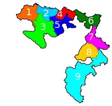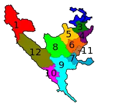 There are twelve units for elections to the subnational House of Representatives of the Federation of Bosnia and Herzegovina. Five are cantons at large, three are sections of more populous cantons, and four contain whole small cantons and sections of larger ones.[4]