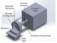 Electrochemical grinding is a process that removes electrically conductive material by grinding with a negatively charged abrasive grinding wheel, an electrolyte fluid, and a positively charged workpiece.[1] Materials removed from the workpiece stay in the electrolyte fluid. Electrochemical grinding is similar to electrochemical machining but uses a wheel instead of a tool shaped like the contour of the workpiece.