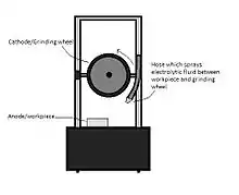 An electrolytic spindle with carbon brushes, acting as a commutator, holds the wheel. The spindle receives a negative charge from the DC power supply, which gives the workpiece a positive charge. The electrolytic fluid is applied where the work contacts the tool by a nozzle similar to that which supplies coolant in conventional grinding. The fluid works with the wheel to form electrochemical cells that oxidize the surface of the workpiece. As the wheel carries away the oxide, fresh metal is exposed. Removing the oxidized fluid may only require a pressure of 20 psi or less, causing much less distortion than mechanical grinding. The wheel is subject to little wear, reducing the need for truing and dressing.[4]