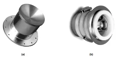 Example of an electron emitting a) Thermionic Emitter and an electron accelerating b) Electron Gun Assembly.[42]