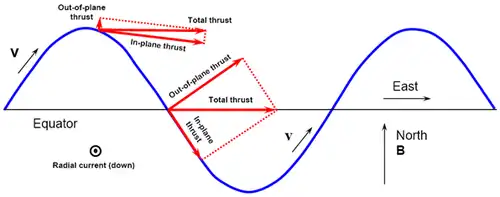 To calculate the in-plane and out-of-plane directions, the components of the velocity and magnetic field vectors must be obtained and the force values calculated. The component of the force in the direction of travel will serve to enhance the orbit raising capabilities, while the out-of-plane component of thrust will alter the inclination. In the below figure, the magnetic field vector is solely in the north (or y-axis) direction, and the resulting forces on an orbit, with some inclination, can be seen. An orbit with no inclination would have all the thrust in the in-plane direction.[70]