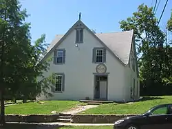 Built of brick with elements of wood and sandstone,[5] and resting on a foundation of ashlar,[6] the house is one-and-a-half stories tall with a steep gabled roof.[5] The gables are placed symmetrically, with one on each of the four sides, and the corners of the roof rise from each corner.[7] Some of the gable peaks and roof corners are ornamented by finials, while the eaves are highlighted by large bargeboards. Stone lintels surround many of the windows, and the house is entered primarily through an off-center trabeated door recessed into the facade.[6] These elements combine to form a high-quality example of the Gothic Revival style of architecture; although less significant than some Gothic Revival houses elsewhere in the state,[7] it is Oxford's leading house of the style.[6]