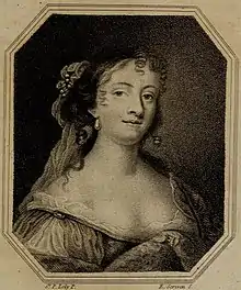 She went with her husband to France[70] and was appointed in 1667 dame du palais or lady-in-waiting to the French Queen, Maria Theresa of Spain.[71] At that time the French court was seated at the Louvre in Paris, not yet at Versailles. At the court she was recognised as a woman of considerable wit and beauty.[72] She also knew how to hold her own at the court of Louis XIV, being said to have "beak and claws".[73] Her husband nevertheless pursued his gallant exploits to the close of a long life, being, said Ninon de l'Enclos, the only old man who could affect the follies of youth without being ridiculous.[74]