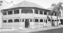 In 1932, Queensland suffered its highest number of polio cases in 30 years.[60] This outbreak focussed public attention on the inadequacy of treatment for victims of paralysis.[61] The following year, local people helped Kenny set up a rudimentary paralysis-treatment facility under canopies behind the Queens Hotel in Townsville.[62] The makeshift clinic expanded as more parents brought their children to be treated by Kenny.[63] In 1934 she enjoyed the support of Eleanor MacKinnon, a key figure in the local Red Cross, for a new clinic.[64] In March 1934 the Queensland Government provided funds for a trial of Kenny's methods at the Townsville Clinic.[65] An initial favourable evaluation of the clinic by Dr Rae Dungan[66] was followed by a more critical report by Dr Raphael Cilento.[67] Her success led to Kenny clinics being established in several Australian cities. Nothing remains of the Townsville Clinic or the George Street Clinic in Brisbane, but the Sister Kenny Clinic in the Outpatients Building of the Rockhampton Base Hospital is now listed on the Queensland Heritage Register.[68]
