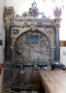 Monument to Elize Hele in Bovey Tracy Church, Devon. Below his effigy are the kneeling effigies of his two wives, facing each other in prayer, behind the left one kneels his young son.[4] On top at each side is an escutcheon displaying the arms of Hele impaling Hender (dexter) and Bray (sinister)