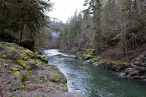 Elkhorn Creek is a 7.6-mile (12 km) long[3] stream in Marion County, Oregon, United States. Its source is on the northern edge of the Willamette National Forest, about 3.5 miles (5.6 km) north of Big Cliff Reservoir. The creek flows mostly west, receiving Big Twelve Creek, Buckhorn Creek, and Buck Creek all from the south, and it enters the Little North Santiam River just south of Elkhorn Woods Park, about 5 miles (8.0 km) north of the city of Gates.[1][4][5] The stream's valley is surrounded by the western Cascade foothills, covered with coniferous trees characteristic of the Pacific Northwest, and lined with red alders at the water's edge. The creek supports runs of rainbow and coastal cutthroat trout, as well as Pacific giant salamanders. On September 30, 1996, a 6.4-mile (10.3 km) portion of the stream, from the mouth nearly to the source, was protected as part of the National Wild and Scenic Rivers System.[6]