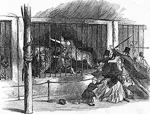 Richard Cooper Todd, surgeon, attached to the Royal Artillery, stationed in Brompton Barracks, said he was witnessing the exhibition at the time of the occurrence and was standing quite close to the rope in front of the den. He saw the deceased enter and going in the tiger did not appear to be very friendly with her; she struck him on going in and he laid down. She then proceeded to her performance with the lion and afterwards turned round and again struck the tiger. It appeared angry and immediately seemed to turn upon the deceased; rearing upon his hind legs and seizing her by the neck, she fell on her back and the tiger crouching over her, he[the surgeon] saw no more of her until removed from the den, when he hastened to her assistance. She was perfectly insensible and had lost a great deal of blood and her face and lips were very pale. She was still alive, the heart was beating, but she was perfectly unconscious. Witness placed his hand on the wound in the neck to stop the bleeding and administered some brandy to deceased, but she was unable to swallow it and in a very few minutes her heart ceased to beat. There were four wounds on the left side of the neck, a slight wound on the right leg and another on the chin, caused by the teeth of the tiger, the under jaw of the animal having caused a very large wound under the chin, which aided by the shock her system had sustained, produced death.The jury returned a verdict to the effect that deceased was killed by a male tiger whilst exhibiting in its den and expressed a strong opinion against the practice of allowing personsto perform in a den with animals.It will be remembered that, when, about two years since, Mr Wombwell exhibited his menagerie to the royal family at Windsor, the "Lion Queen" was especially anxious to exhibit the extraordinary command which she had acquired over the fierce animals, but her Majesty expressly forbade the performance. Since then the unfortunate deceased had been the great attraction of the exhibition in all the principal towns of the United Kingdom. It is to be hoped that this horrible termination to her career may have the effect of preventing such performances for the future.[5]