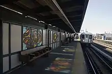 In 1978 and 1979, Ausby received artist grants through the Cultural Council Foundation Artists’ Project, which was funded under the Comprehensive Employment and Training Act. Through these grants, Ausby was able to direct the multimedia performance piece InnerSpace/OuterSpace, which was performed at the Museum of Natural History, New York and incorporated projections of his paintings and sculptures.[6] In 2005, Ausby was commissioned by the MTA to design the stained glass piece Space Odyssey, which is now installed at the Marcy Avenue station in Williamsburg, Brooklyn.