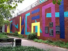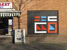 Eltono is a French artist born in the suburbs of Paris in 1975.[1] His work is mostly influenced by his graffiti background.[2] He started painting around 1989[3] in his neighborhood[4][5] mostly on train tracks and highway walls. "Eltono focused mainly on the railway lines to the northwest of the city, painting in the traditional silver and black, block letter Parisian style."[6] He lived in Madrid from 1999 to 2010 (where he got his pseudonym[7]), then in Beijing[8] from 2010 to 2014 and since 2014 lives in the south of France.[9] In 1999, while living in Madrid, he started painting abstract symbols with tape and acrylic paint.[10] "It was then that he developed the colorful geometric box patterns for which he is now known."[11] "As Eltono himself suggested, his move away from traditional graffiti was produced so as to find a harmony with both the material and the social body of the city (integrating both its architectonic and societal elements in a more consensual manner)."[12] "Eltono also rejects conventional letterforms in favor of a minimalism device with which to negotiate space."[13]