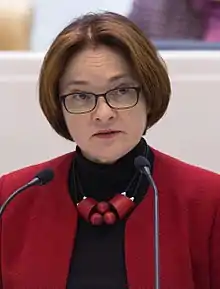 Elvira Sakhipzadovna Nabiullina (Russian: Эльвира Сахипзадовна Набиуллина; Tatar: Эльвира Сәхипзадә кызы Нәбиуллина, romanized: Elvira Säxipzadä qızı Näbiullina; Bashkir: Эльвира Сәхипзада ҡыҙы Нәбиуллина; born 29 October 1963) is a Russian economist and current head of the Central Bank of Russia. She was president Vladimir Putin's economic adviser from May 2012 to June 2013 after serving as the minister of economic development from September 2007 to May 2012.[1][2] As of 2019, she was listed as the 53rd most powerful woman in the world by Forbes.[3] She has the federal state civilian service rank of 1st class Active State Councillor of the Russian Federation.[4]
