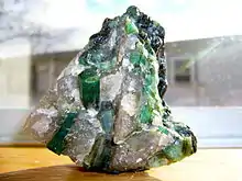 Brazilian emerald (grass-green variety of the mineral beryl) in a quartz-pegmatite matrix with typical hexagonal, prismatic crystals.[10]