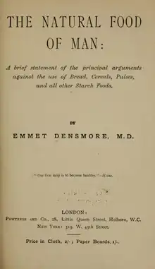 - ↑ Densmore, Emmet. (1890). The Natural Food of Man: A Brief Statement of the Principal Arguments Against the Use of Bread, Cereals, Pulses, and All Other Starch Foods. London: Pewtress and Co. p. 23