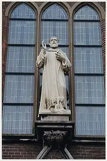 Saint Engelmund is depicted as a pilgrim abbot with a fountain springing under his staff.[4]