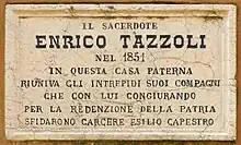 Tazzoli was arrested the first time on 12 November 1848 for giving a sermon in Duomo against the tyrannical imperial powers who allowed the sack of Mantua of 1630, evidently an allusion to the imperial Austrians of his time.[3] The arrest was ordered by the Captain Carl Pichler von Deeben, the same man who ordered Ugo Bassi shot in Bologna in 1849, and who in 1851 ordered the same fate for Giovanni Grioli. For the moment, however, the arrest was done only as a warning. In a search of the house he turned a blind eye to the tricolor scarf that was found among the books, but warned the priest's mother to burn the 5 giornate (5 days) of Ignazio Cantù and the poems of Giovanni Berchet. Don Enrico was then released, and on returning home found a large crowd applauding his courage and ideas.[4]