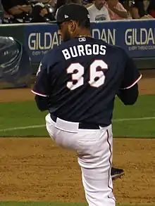 Burgos was a starting pitcher during most of his seven-plus years in the minor leagues, where he demonstrated the ability to strike out batters but also had a high walk rate. His ERA during his first four seasons was 5.93.[1] In 2012 the Diamondbacks moved him to the bullpen, where his ERA decreased to 2.35 in 2012 and 3.88 in 2013.[1] Between 2013 and 2014, he cut his walk rate over 50 percent, from more than one walk per inning in Low-A South Bend to 4.3 walks per nine innings in High-A Visalia.[4] He was added to the Diamondbacks 40-man roster on October 21, 2014.