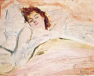 Ensueños de Amor, literally "Daydreams of Love", is a "dreamy" oil on wood painting by Filipino painter and revolutionary activist Juan Luna. It depicts Luna's wife Paz Pardo de Tavera while sound asleep. It is currently a part of the art collection of the Lopez Museum.[1]