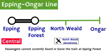 In the 1950s, there were attempts to improve the service on the branch, and it was electrified in 1957.[3] Due to the low-cost electrification, although the branch could support eight-car trains as far as North Weald, a maximum of four cars could run to Ongar. The voltage drop along the end-fed line was too great to support full-length trains,[4] and the short platforms were not long enough to support eight-car trains. Hence the Epping to Ongar branch was normally operated as an isolated extension of the Central line, with a few through workings south to Loughton. However, for two days every year there were through trains from London to North Weald, for the North Weald airshow, on the Saturday and Sunday of its opening at the aerodrome almost adjacent to the station. The normal Epping to Ongar shuttle dovetailed with this service, passing the terminating trains on the adjacent line during its westbound journey. The through trains were operated as extra trains on the normal weekend Central line timetables, only four cars long due to the restricted platform length at North Weald.