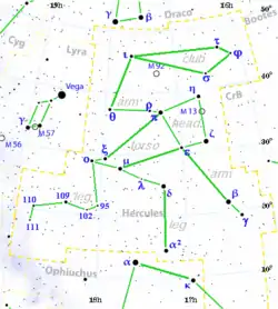 Epsilon Herculis, Latinized from ε Herculis, is a fourth-magnitude multiple star system in the northern constellation of Hercules. The combined apparent visual magnitude of 3.9111[1] is bright enough to make this system visible to the naked eye. Based upon an annual parallax shift of 21.04 mas as seen from Earth,[1] it is located 155 light years from the Sun. The system is moving closer to the Sun with a radial velocity of −25 km/s.[11]