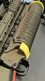New modified M203 grenade launcher fitting the M10 rifle and with the ability to fire high-velocity grenades.[35] Can be used standalone on a stock or mounted on the rifle.