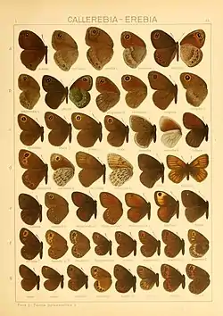 E. edda Men. (= intermedia Trybom) (35 c). Wings above coffee-brown , darker towards the base, distally with a russet-brown sheen. There is before the apex a large rounded reddish yellow spot bearing a black ocellus composed of two and having two small white pupils. The hindwing is without markings. On the forewing beneath the yellow spot is larger and lighter than above, being more ochre -yellow, the double ocellus having bright white pupils. The hindwing beneath dark brown, thinly dusted with whitish, especially towards the costa. At the apex of the cell a rounded white spot , and before the distal margin 3 — 4 white dots. Antenna black-brown above, finely ringed with white and brown beneath, except the russet-brown club. The sexes are the same in markings and size, but the yellow spot of the forewing is paler in the female than in the male. Elwes found some specimens with accessory ocelli below the large subapical ocellus. — This species is the first of that group of Erebias which come nearest to the preceding genus (Callerebia). It resembles Callerebia also in that it is not a really alpine insect, but occurs more in the hills. In East Siberia, in the Amur-district according to Graeser in June and July in swampy woods, but rare. Very local in the Altai, but abundant in some places, occurring already as low down as 4000 ft. It flutters with a weak flight among the grass, always setting on stones in dry brooks. [2]